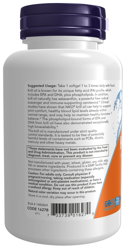 Масло криля, богатое жирными кислотами ЭПК и ДГК, а также фосфолипидами, содержит естественный антиоксидант астаксантин, поддерживающий иммунитет. Масло криля способствует здоровью суставов, поддерживает нормальный уровень липидов в крови и положительно влияет на женский организм. Фосфолипидные формы ЭПК и ДГК демонстрируют высокую биодоступность.