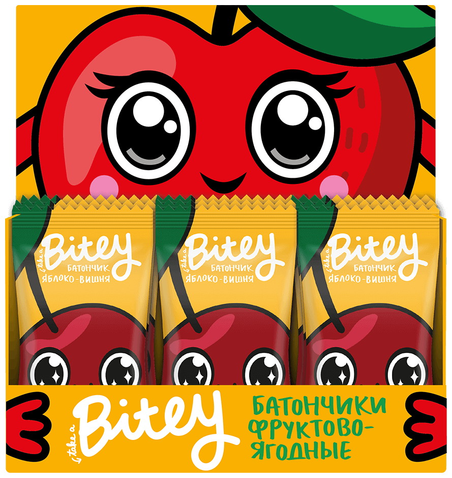 Снеки Bitey — это первый полезный перекус для детей, сделанный в России! В каждом батончике удивительное сочетание натуральных спелых яблок, ароматной вишни и кукурузной крупки. И все это без консервантов, сахара, лактозы и глютена! Благодаря сбалансированному составу, витаминам, минералам и клетчатке Bitey заменяет 1 из 5 рекомендованных приемов фруктов и овощей̆ в день. Польза в каждом кусочке!