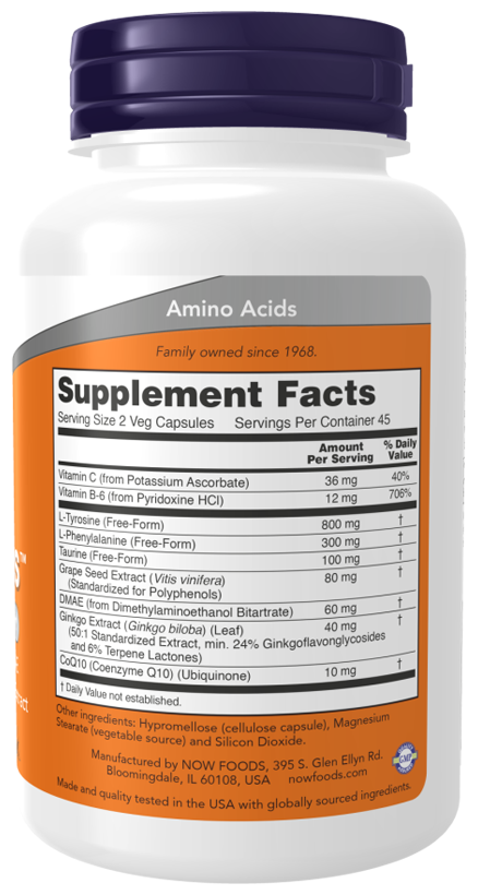 тирозин, фенилаланин, таурин, экстракт косточек винограда (мин. 90% полифенолов), аскорбат калия (витамин С), диметилглицин, витамин В6 (пиридоксин гидрохлорид), коэнзим Q10 (убихинон), целлюлоза (оболочка капсулы), стеарат магния (Е470), диоксид кремния (Е551).